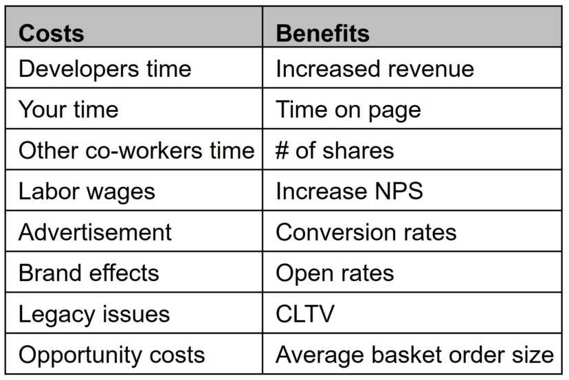 To conclude, we’ll need to perform a cost-benefit analysis. Wherever the benefits exceed the costs, that hypothetical MVP could be invested on, to become a fully functional product. Here are some things you could consider for your cost-benefit analysis: